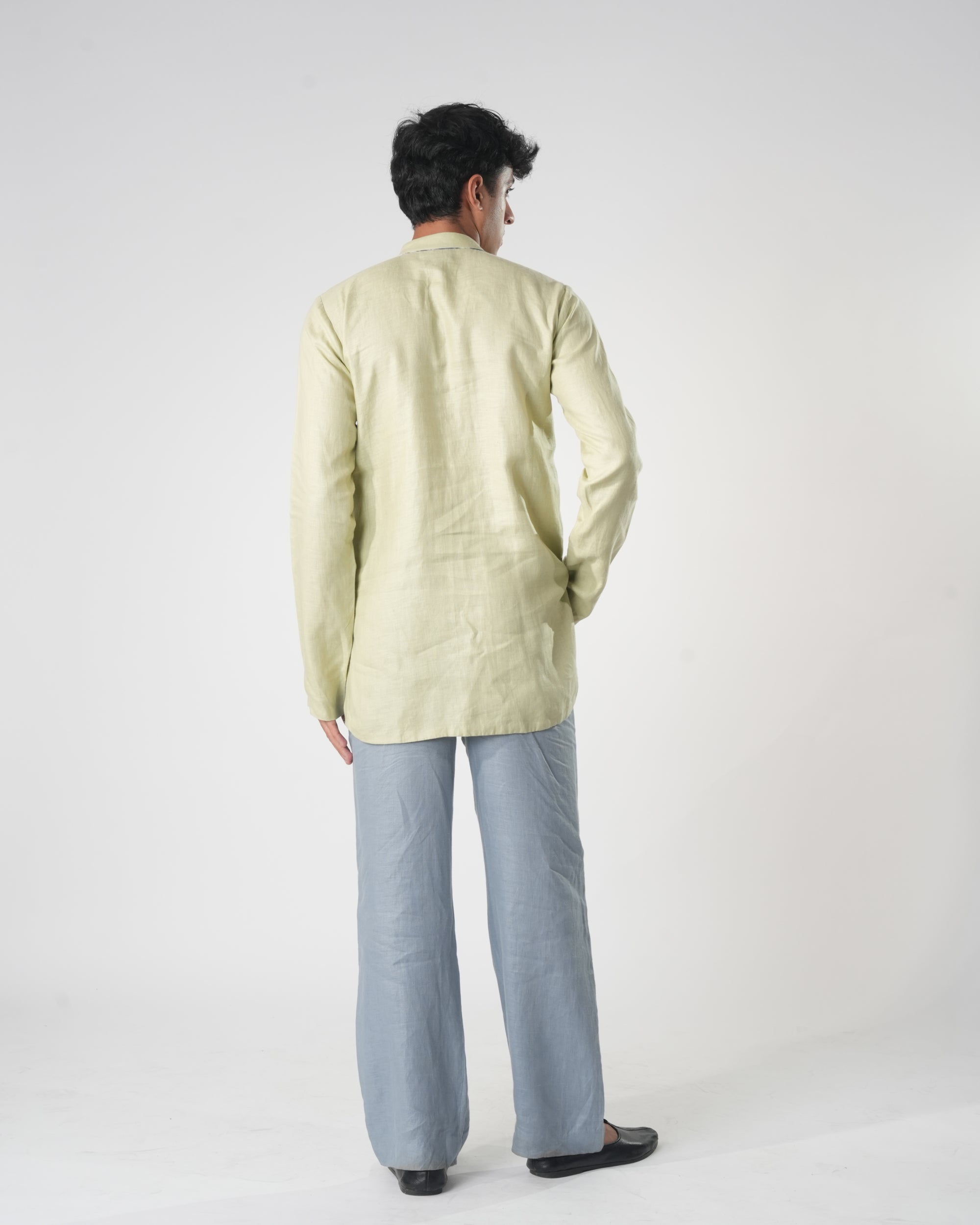 This classic kurta features a timeless design with modern detailing. The mandarin collar is complemented by a buttoned placket, adding a touch of sophistication to the piece. Subtle embroidery runs along the side, enhancing its elegance with intricate craftsmanship. The straight-cut silhouette and long sleeves ensure a comfortable yet polished fit, making it suitable for both formal and casual settings. Perfect for pairing with trousers or churidars, this versatile kurta is ideal for cultural events, gatherings, or everyday wear.