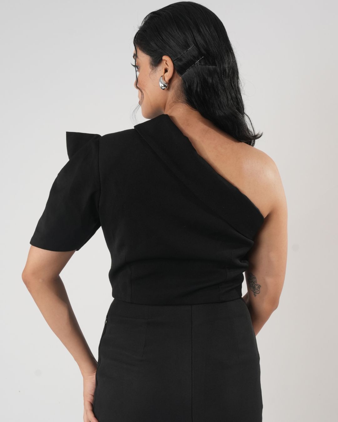The One-Shoulder Crop Jacket offers a modern, chic style that highlights your collarbone for a look that’s both edgy and elegant. Pair it with a skirt for a playful vibe, or style it with trousers for a more refined, sophisticated appearance.
